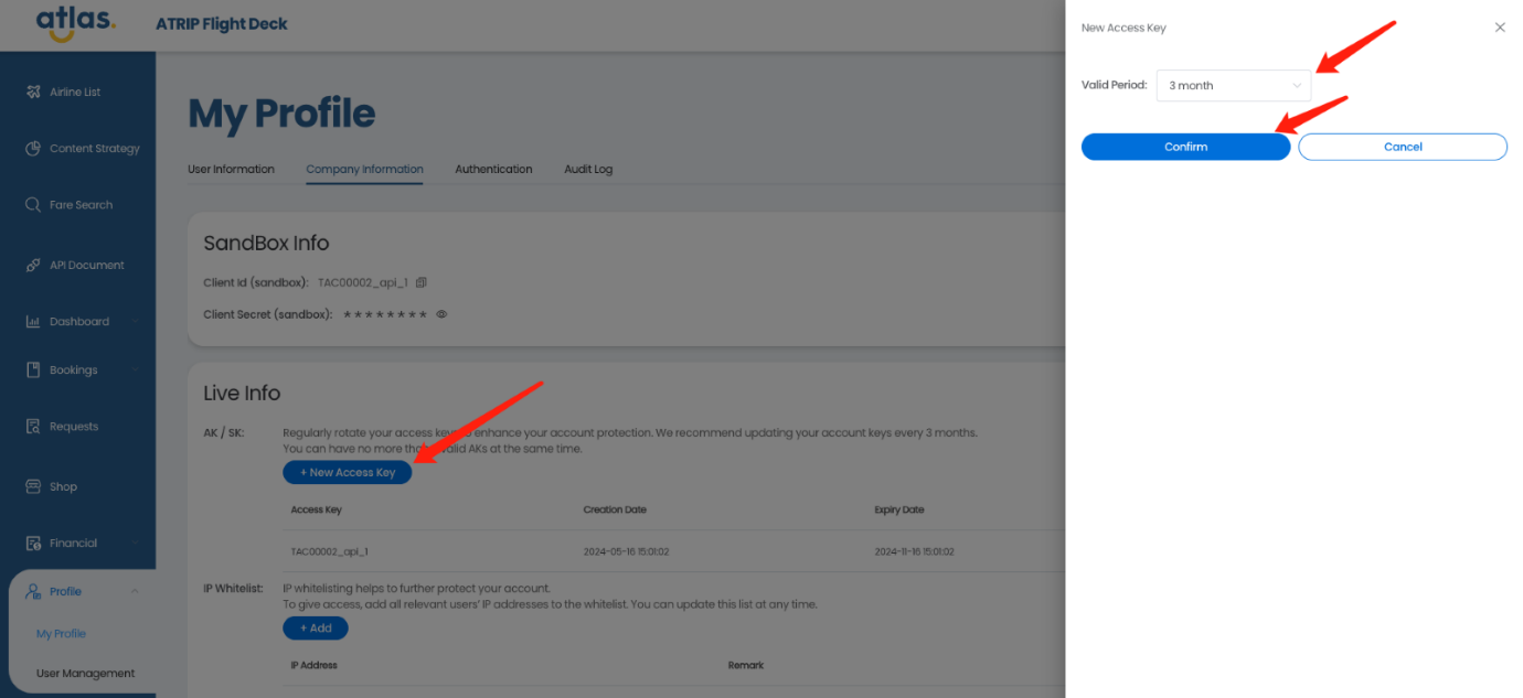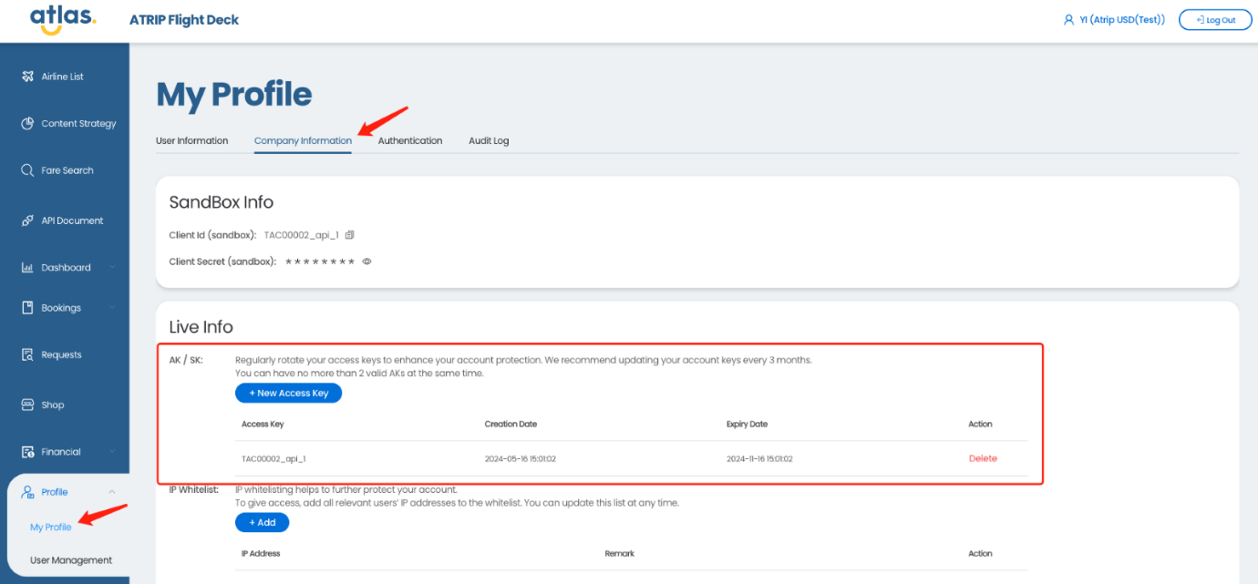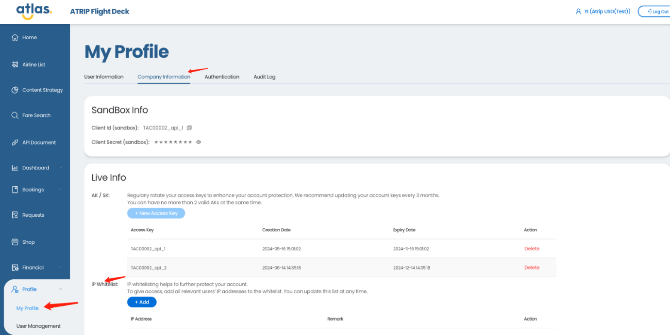 要设置或重置您的访问密钥,请访问ATRIP Flight Deck账户上“个人资料”页面的“公司信息*”部分,并按照页面上的说明操作。