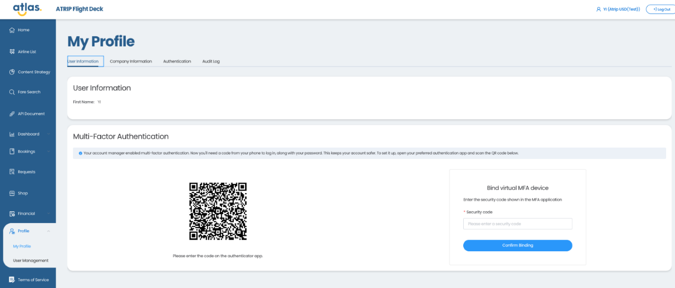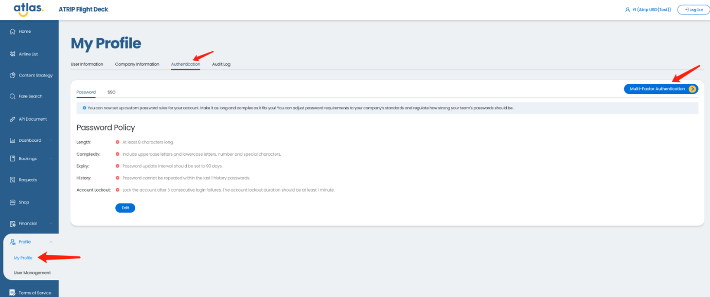 MFA要求用户设置额外的验证方法以访问ATRIP Flight Deck或使用特定功能(例如,支付和余额充值)。