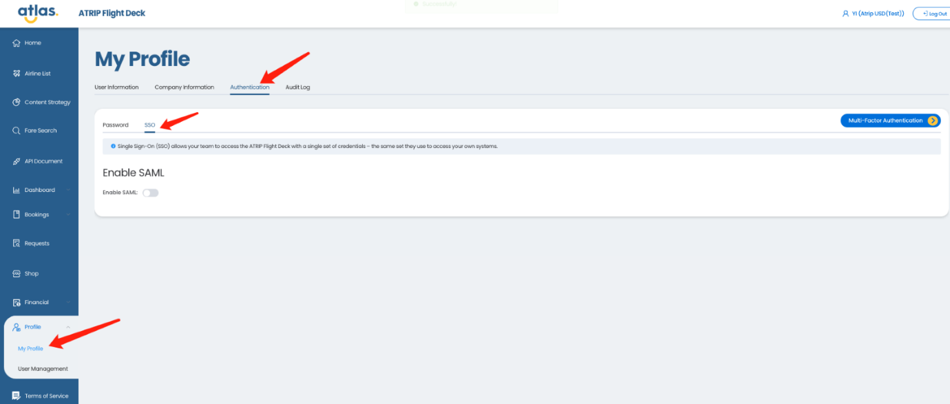 访问 Flight Deck --> My Profile --> Authentication --> SSO.