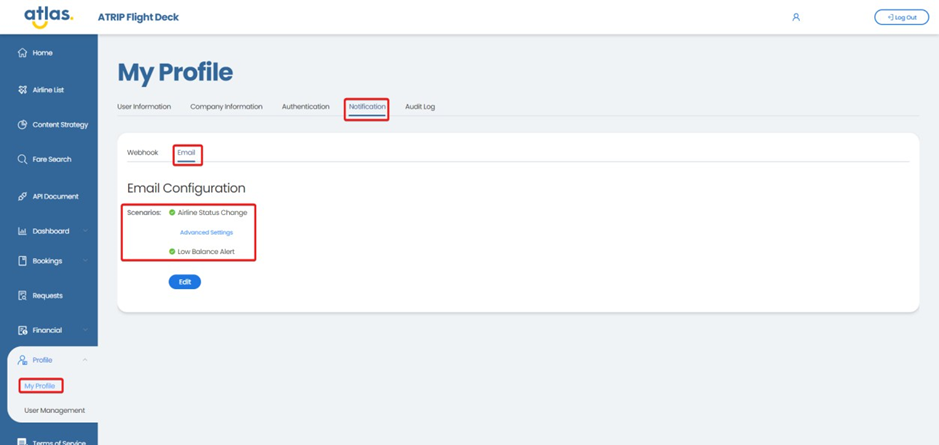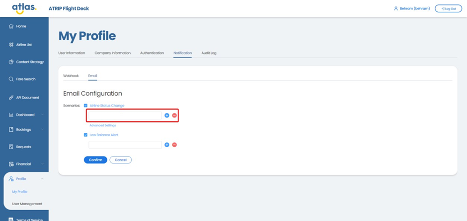 阈值金额已在运营台配置。ATRIP将监控阈值金额,当余额低于该金额时,将触发到本部分配置的电子邮件地址的电子邮件。