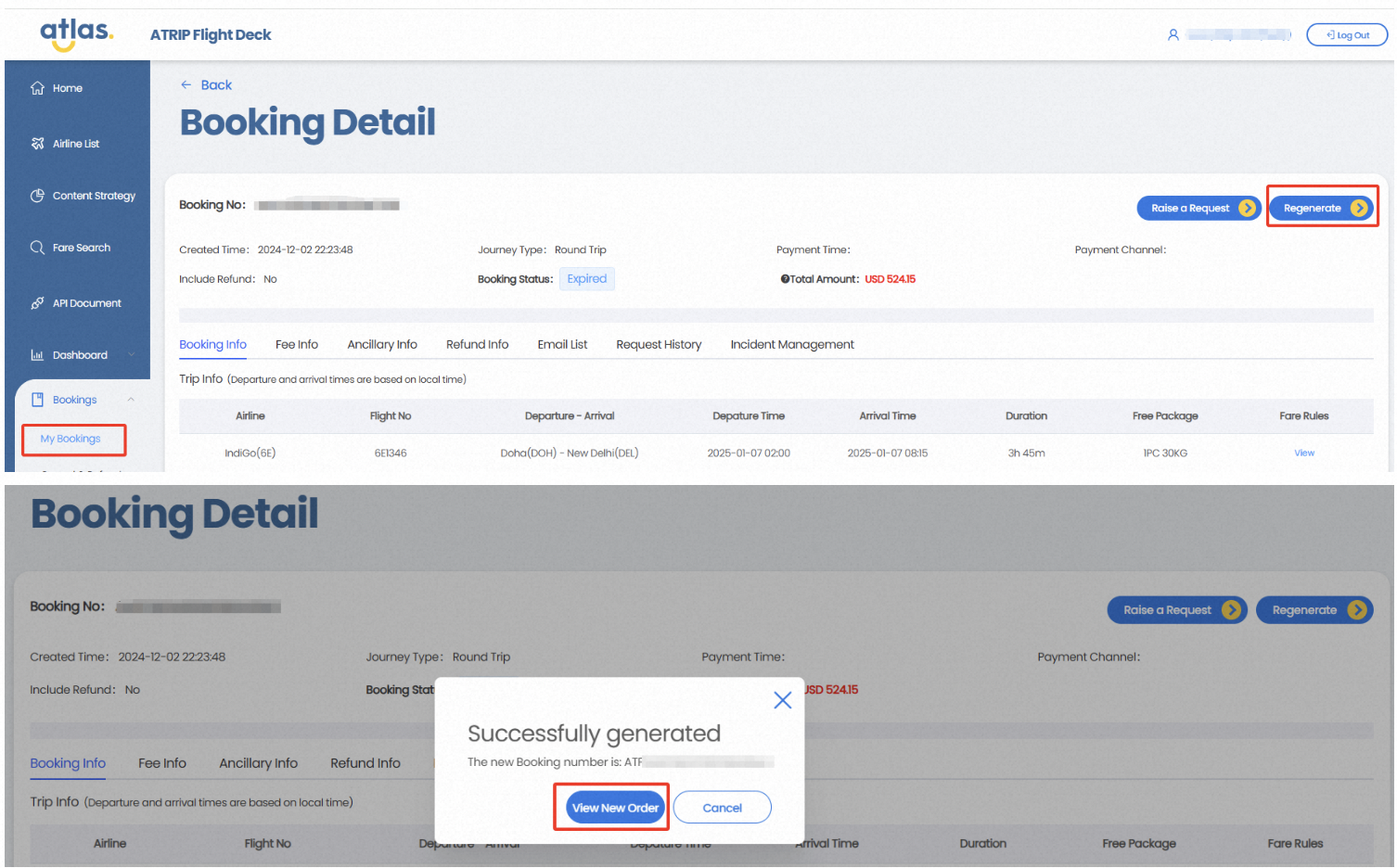 1. 登录ATRIP Flight Deck,进入“my bookings”并找到订单号。点击“重新生成”以创建新订单,您将能够查看新的订单详情。